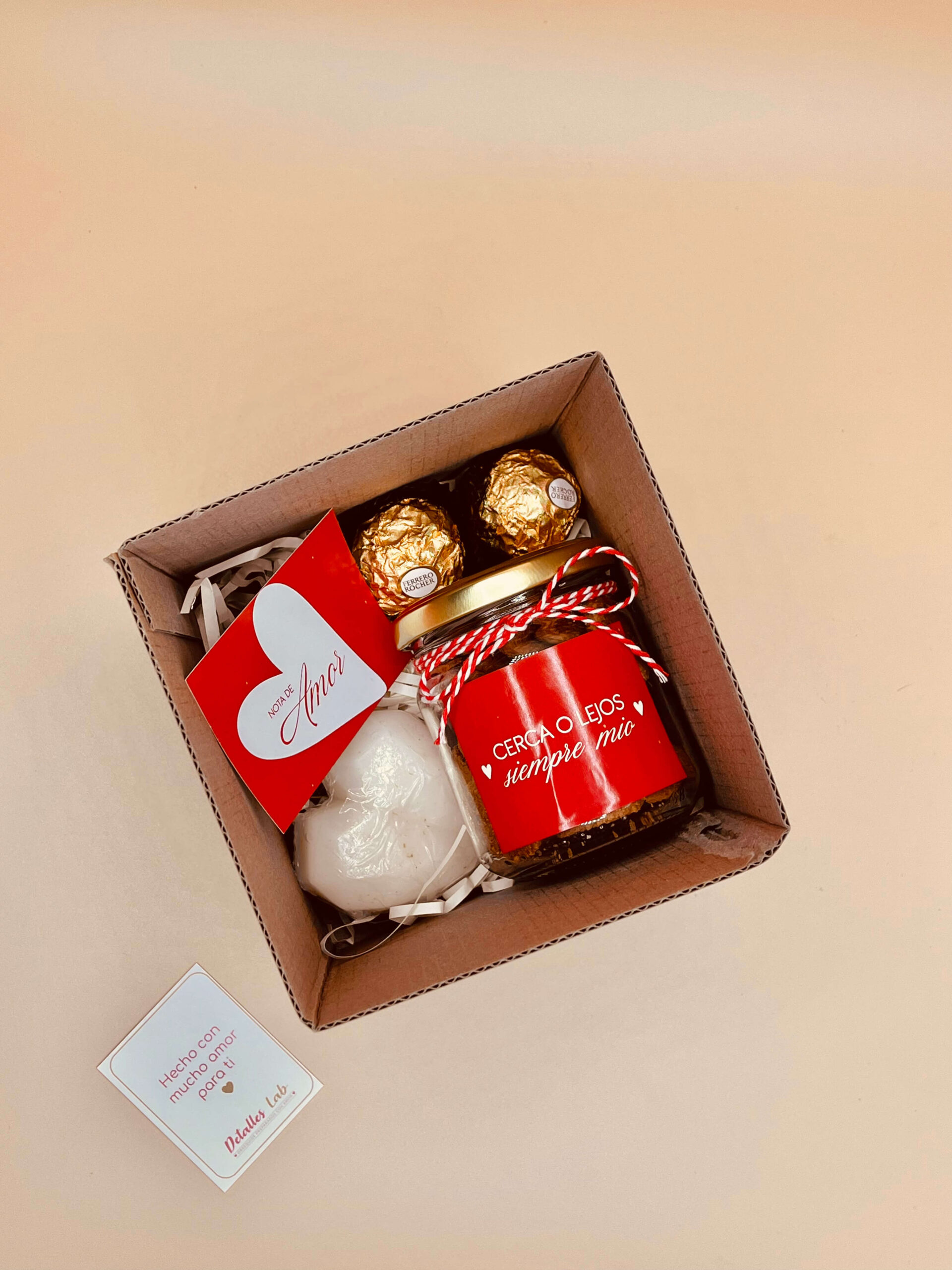 Este box incluye brownie red velvet en frasco, bombones Ferrero Rocher y un jabón artesanal, convirtiéndolo en un regalo romántico para San Valentín ideal para quienes buscan algo diferente y significativo.